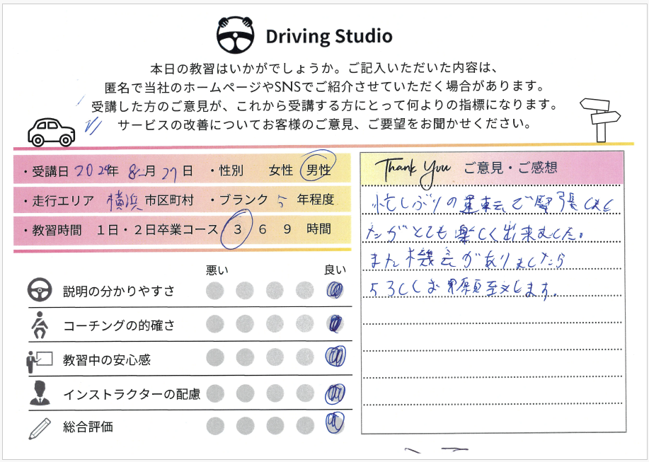 久しぶりの運転で緊張しましたが、とても楽しくできました。また機会がありましたら宜しくお願い致します。